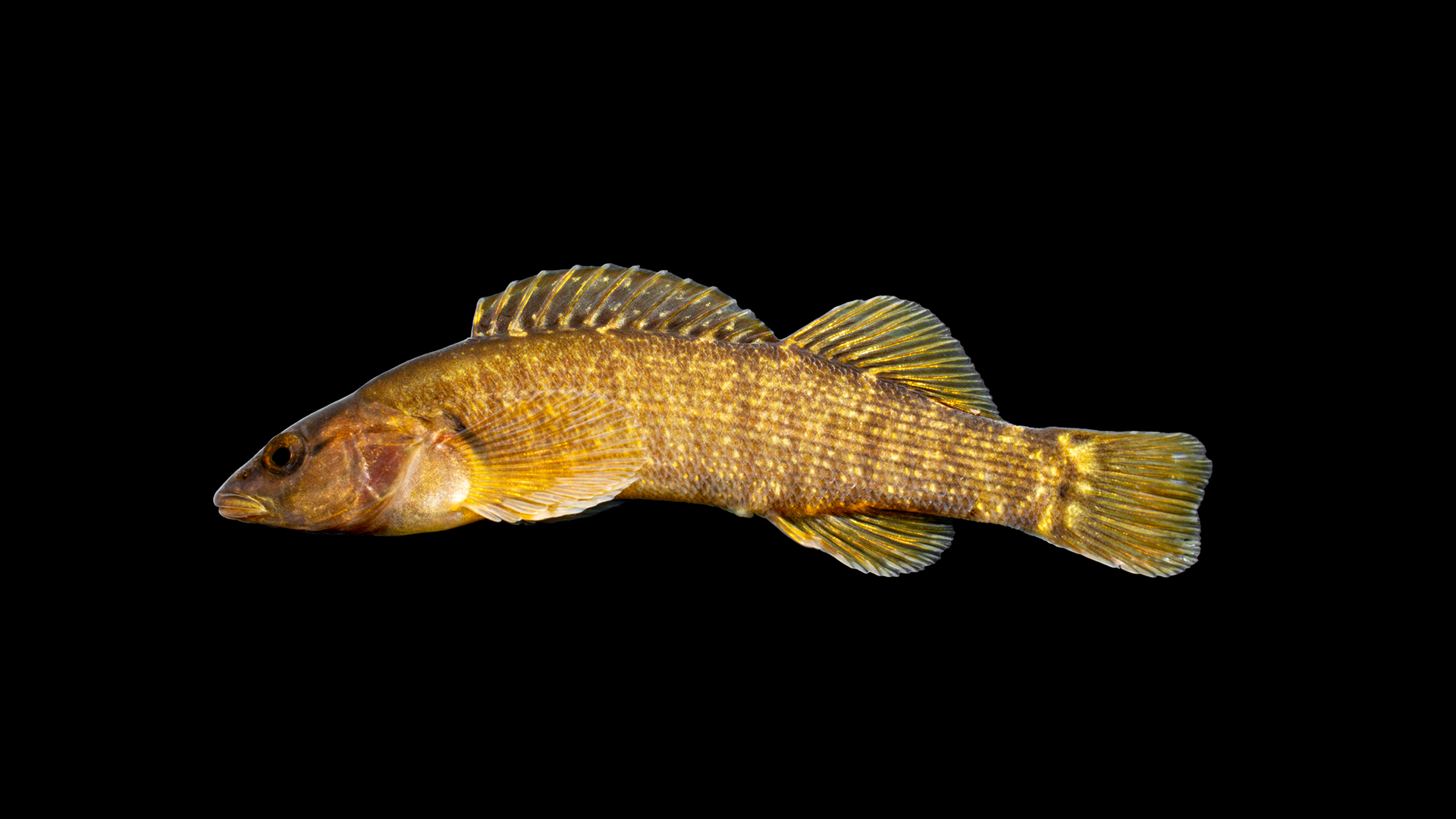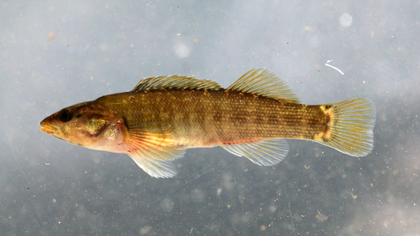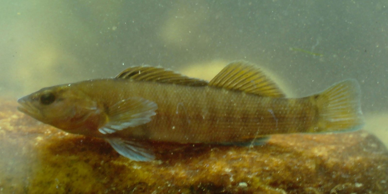 Unique Characteristics: Belly and interpelvic area lacking modified scales. Lateral line normal, not arched upward. 1st anal spine stiff, as thick as 2nd spine. Sides with horizontal streaks along each scale row. Compressed body. Extremely pointed snout. 11-15 narrow dusky bars on the side. Male is olive to blue with turquoise fins. Black spot at front of first dorsal fin. Female yellow-brown with no spots on fins. Opercle naked. Soft dorsal, caudal, and anal fin margins not black, light submarginal band absent; fins not spotted with black; no red spots on body or fins. Restricted to Nolichucky basin.