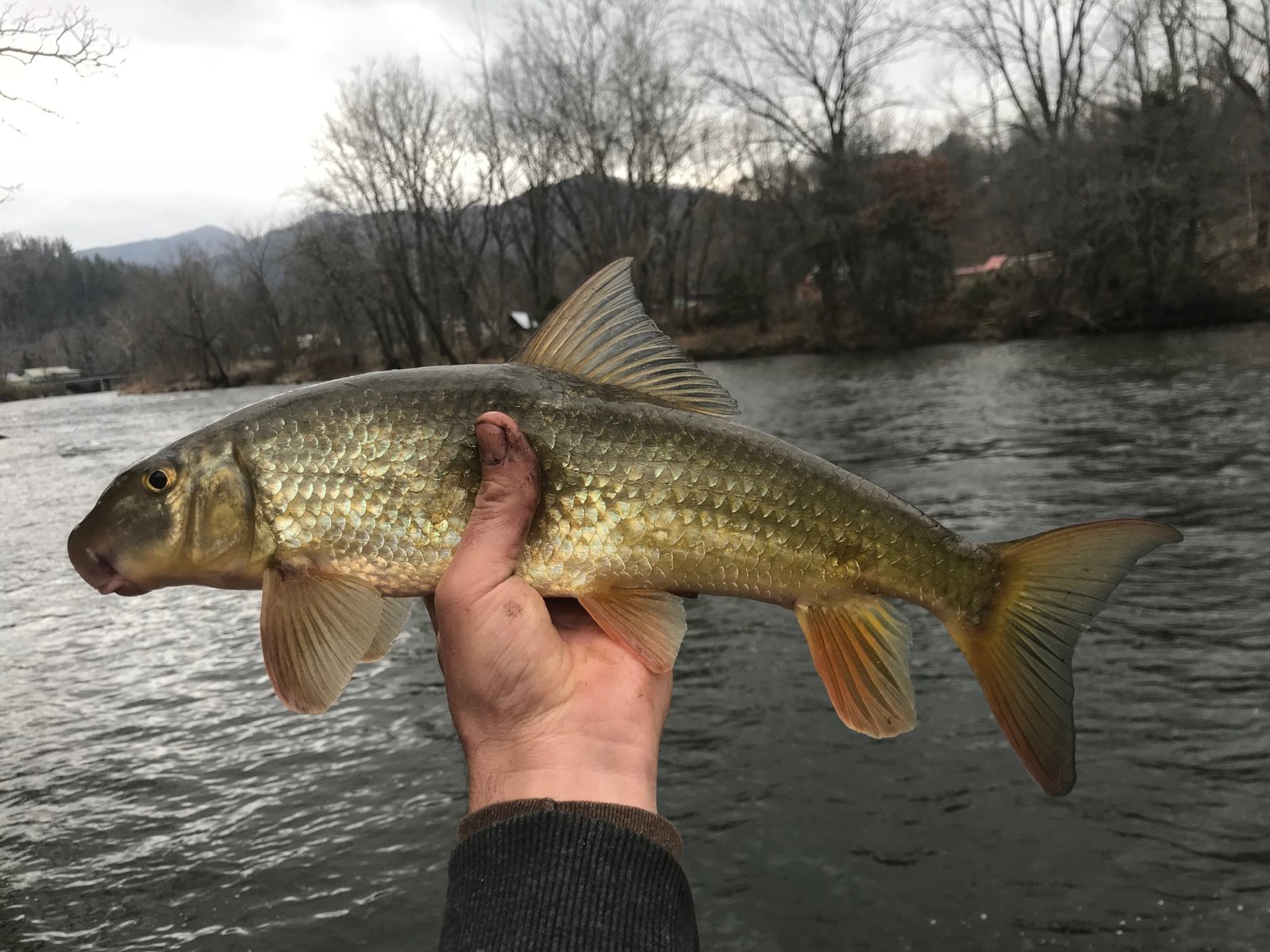 River Redhorse Moxostoma carinatum. Circumpeduncle scales modally 12. Pharyngeal arch stout, lower teeth large, molariform. Lips plicate. Head medium or large. Scale bases dark. Upper body dominantly brassy, coppery, or olive in life. Tail red. Snout of breeding males with obvious medium-sized nuptial tubercles. Restricted to Tennessee River drainage basins.