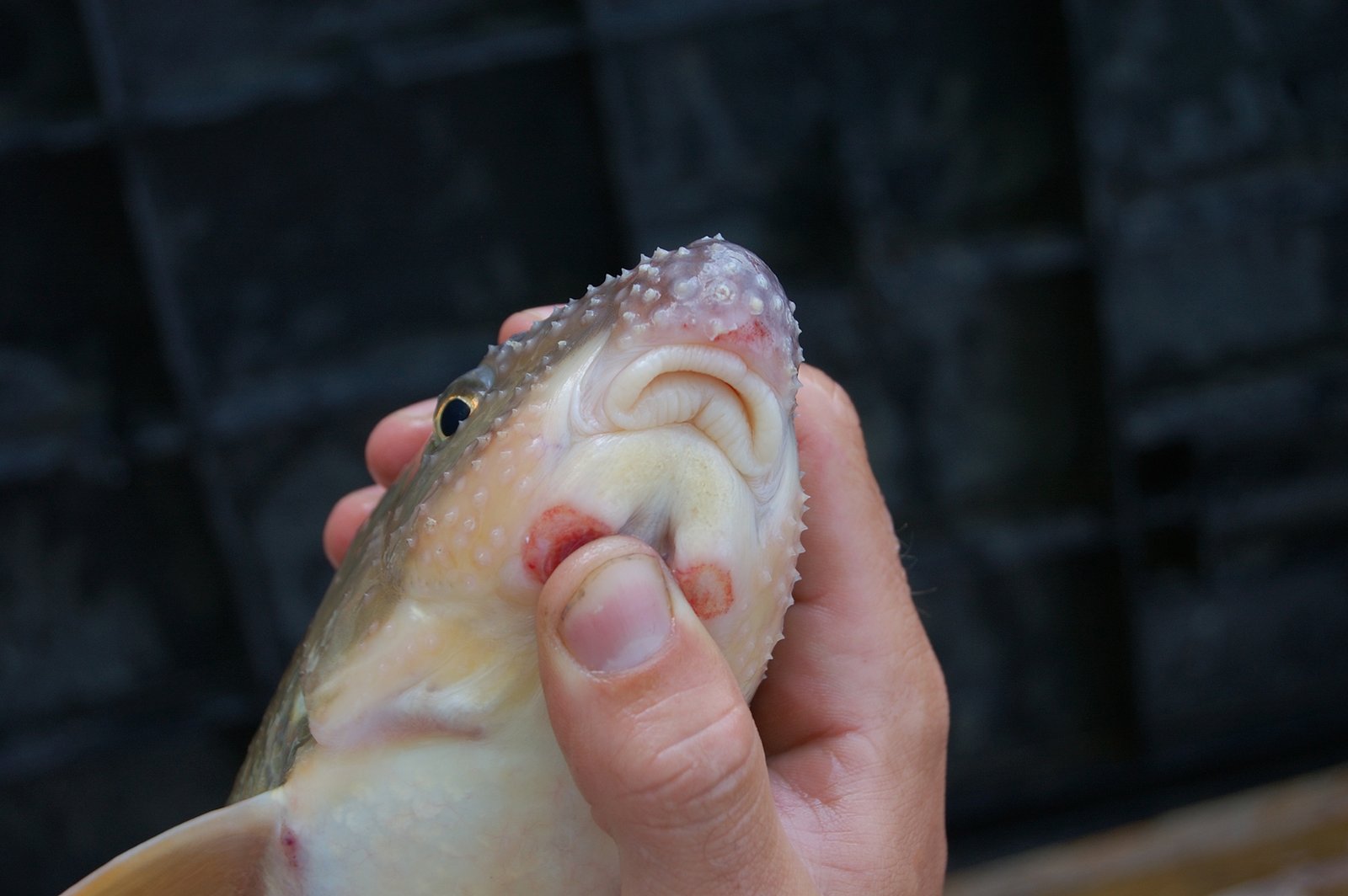 V-lip Redhorse Moxostoma pappillosum. Circumpeduncle scales modally 12. Lower lip V-shaped. Lower lip papillose, papillae rounded at edges, regularly arranged, small, and mostly subequal or equal in size. Front of upper lip papillose. Lower lip with smoothly curved posterior margin, not abruptly thinned at a point distinctly anterior to its juncture with upper lip. Dorsal fin margin of adults and large juveniles almost always slightly falcate or moderately concave. Caudal peduncle shallow.