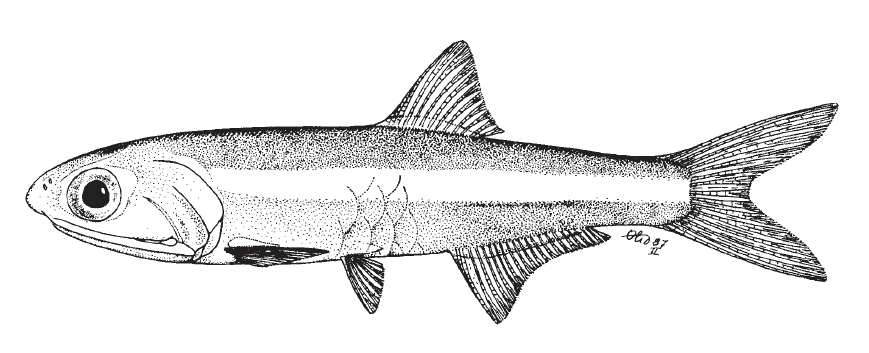Dusky Anchovy, Anchoa lyolepisSnout long, length about equal to eye diameter. Silver stripe on side very wide rearward and bordered above by thin black stripe. Maxilla long, tip pointed, reaching onto or beyond preoperculum. Pseudobranch long, greater than eye diameter, extending onto inner face of operculum.