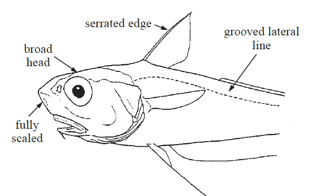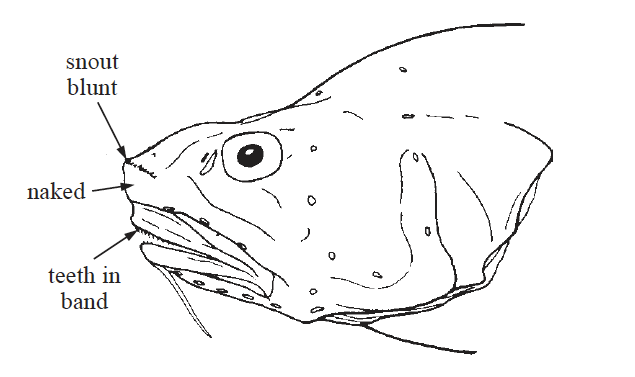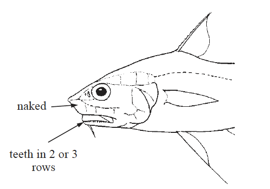 Unique Characters: Premaxillary teeth in a narrow to broad band. Lower jaw with 1 row of teeth. Snout low and blunt, barely protruding. Barbel 5-18% of head length. Pelvic fins with 8 or 9 rays. Interorbital space 32-35% of head length.