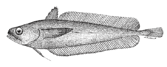Family Moridae – Body elongated, rounded in front of abdomen, more laterally flattened behind, tapering to a narrow caudal peduncle. Teeth few or lacking on roof of mouth. Two dorsal fins, the first short-based and triangular, the second long-based, its length more than half total length. Anal fin long-based, its length 1/2 of, or longer than, that of second dorsal fin. Pelvic fins thoracic, small, with 2-6 rays, the bases well separated. Caudal fin small, margin rounded to slightly forked, separated from dorsal and anal fins. Abdominal light organ in some species, seen externally as small, black naked fossa anterior to vent.
