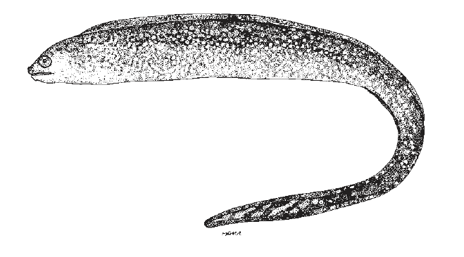 Blacktail Moray, Gymnothorax kolpos. Teeth not numerous, some long canines; intermaxillary teeth 3 rows across, maxillary teeth in 1 row (few inner teeth in young). Snout blunt, jaws short; teeth wedge-shaped and serrate, no long canines. Three pores along upper jaw. Head and body spotted dorsally and ventrally; tail dark, with few large white spots. Dorsal fin with dark margin, with body coloration basally.