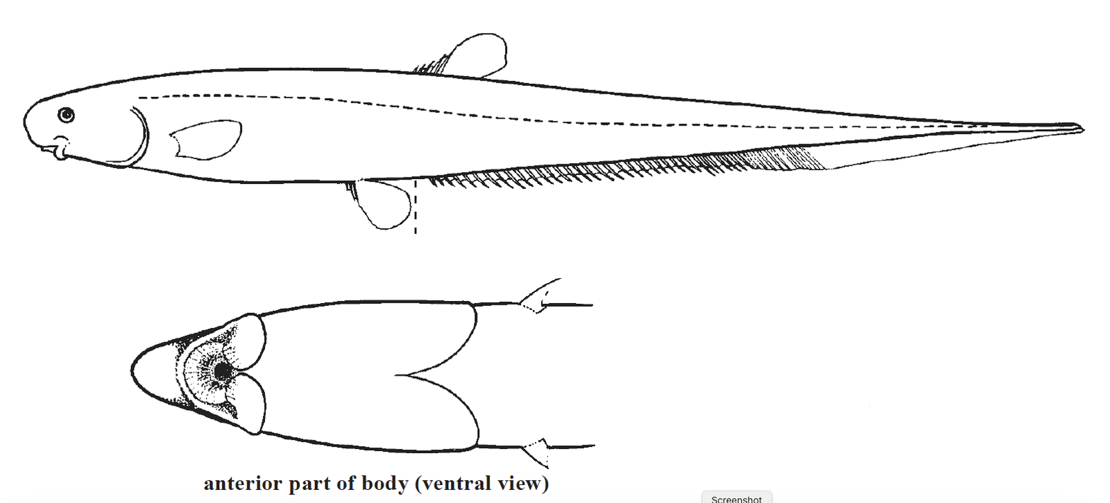 Unique Characteristics: Tail slender and tapering to a point. Mouth inferior, small and sucker-like; upper lip with thick, pleated folds; posterior end of maxilla bent sharply downward, forming a flap-like structure; fleshy papillae on snout bordering upper lip. Teeth absent. Dorsal fin short-based, located above anus, the first 4-6 rays hard and spinous, increasing in length from front to back, the remainder soft and segmented, membrane connecting all rays except first 1-3 spines. Anal fin long, extending from just behind anus to tip of tail, anterior rays spinous, posterior rays segmented, the transition gradual (FAO 2002).