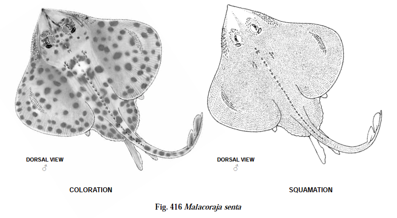 Unique Characteristics: Tip of snout firm; rostral cartilage moderately stout to stout. Anterior pectoral-fin rays distinctly separated from tip of snout. Snout generally not elongated. Anterolateral margin of disc straight to slightly convex (line connecting tip of snout to anterior aspect of lateral corner of disc intersecting disc). Ampullar pores on ventral surface of disc not darkly pigmented. Distal fourth to third of tail without distinct thorns but uniformly covered with denticles
