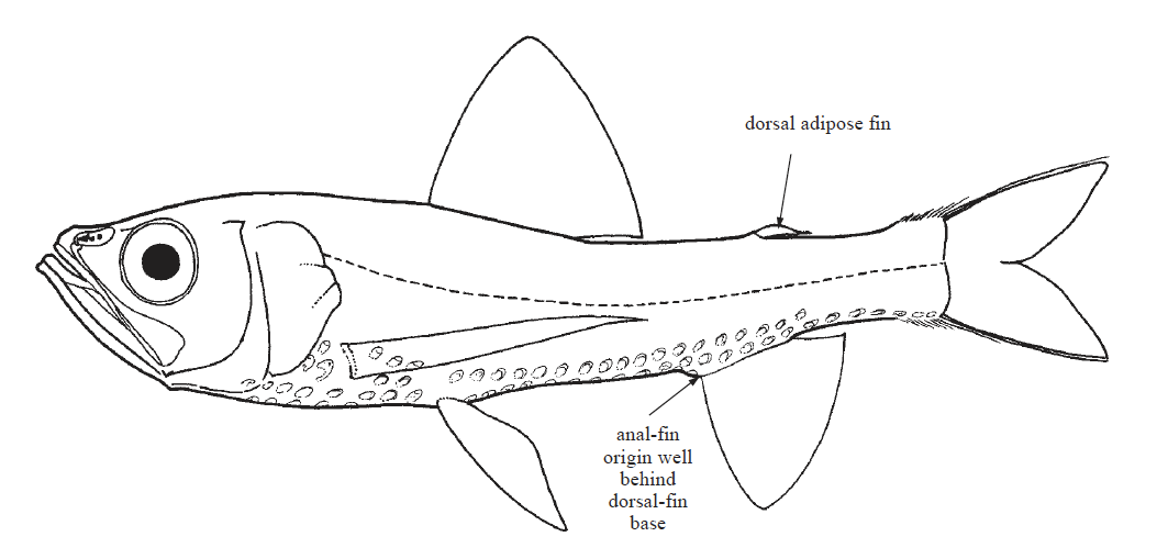 Unique Characteristics: Photophores present; upper lateral series of photophores extends only to about anus. Eye large, about 1 time in snout. Upper jaw extending to about posterior margin of eye. Gill rakers usually 11 (rarely 12-14).
