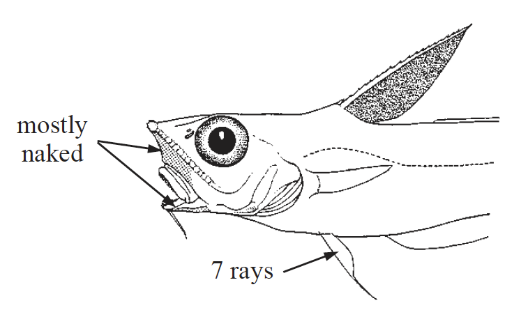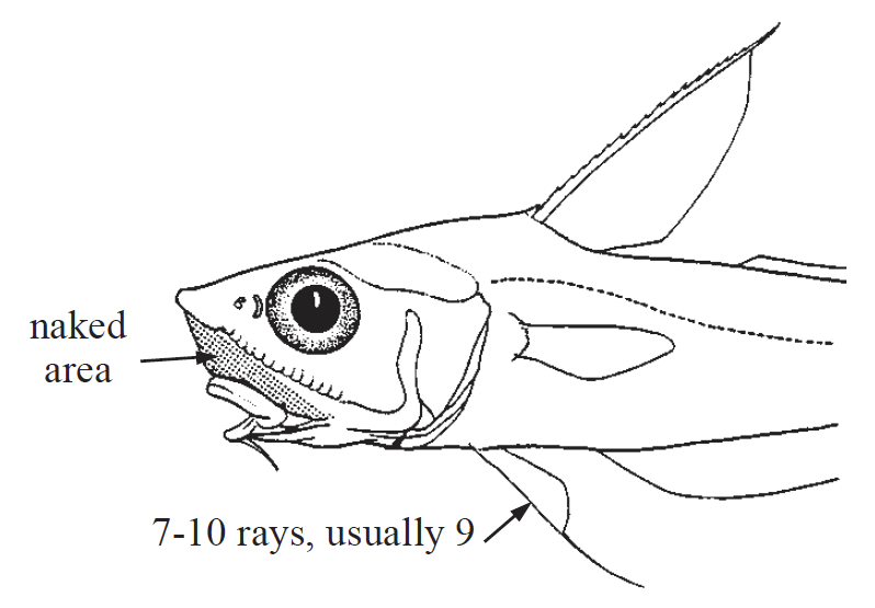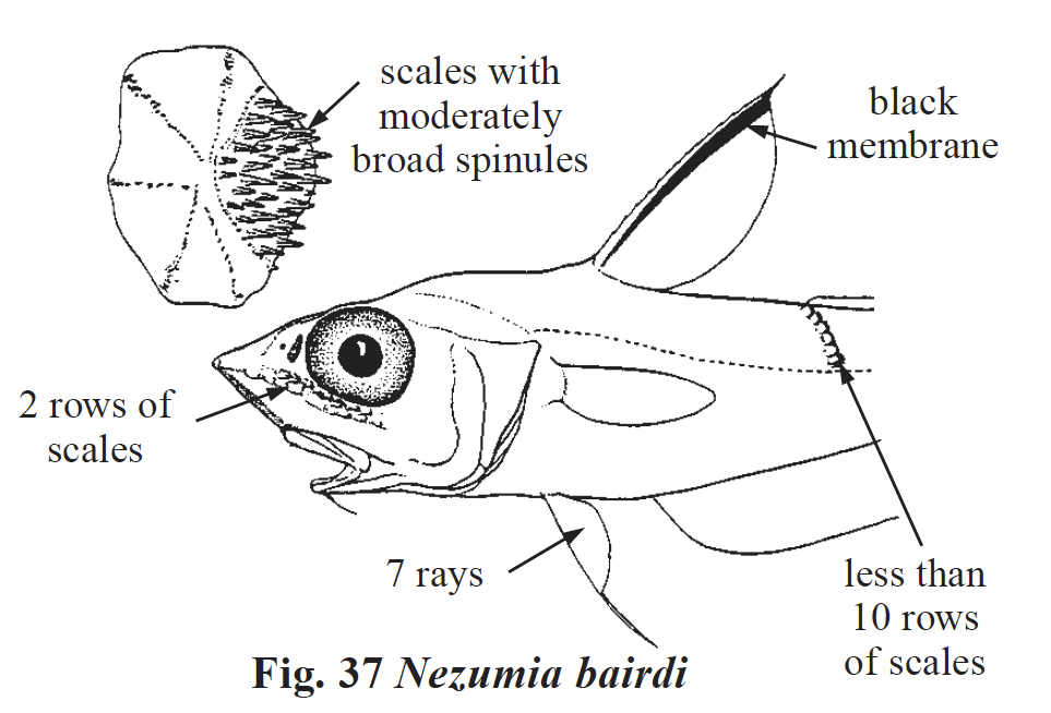 All Nezumia — Anus surrounded by a broad margin of naked skin or far removed from anal fin. Branchiostegal rays 7. Teeth in lower jaw in a 2 or more rows or in a broad band. Fossa between bases of pelvic fins present or absent, not bean-shaped. Few or no scales on branchiostegal rays. Underside of snout usually with broad to narrow naked area above upper lip. Snout with or without a tubercular scale at tip, ridges of head with or without enlarged, coarsely spined scales. Total gill rakers on inner side of first arch 8-11, rarely 12;. Leading edge of snout not distinctly marked in black.