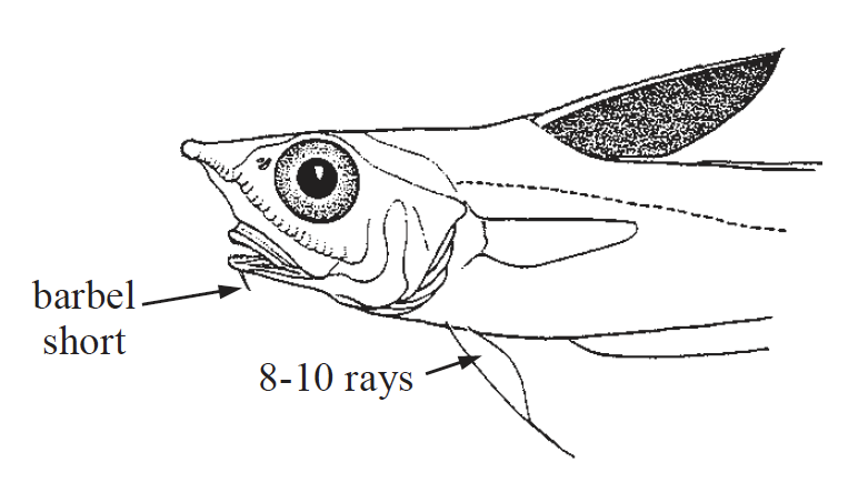 Common Atlantic Grenadier Nezumia aequalis. First dorsal fin with a prominent black tip or membrane between serrated spinous ray and first branched ray. Pelvic-fin rays usually 7-9, rarely 10.First dorsal fin with a prominent black tip.