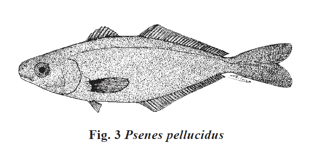 All Psenes Species: Origin of dorsal fin before, or directly over in large specimens, insertion of pectoral fins. No scales on top of head forward of eyes. Body usually deep (maximum depth about 2.5 times in length or less), but elongate in large specimens.