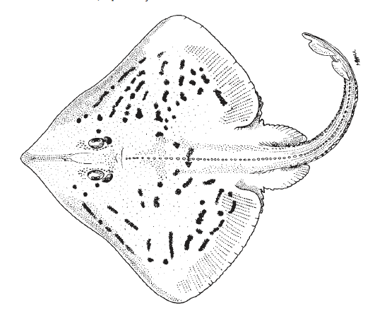 Unique Characters: Tip of snout firm; rostral cartilage moderately stout to stout. Anterior pectoral-fin rays distinctly separated from tip of snout. Snout generally not elongated. Anterolateral margin of disc straight to slightly convex (line connecting tip of snout to anterior aspect of lateral corner of disc intersecting disc). Ampullar pores on ventral surface of disc not darkly pigmented. Midrow thorns on disc (if present) small to moderate in size and without stellate bases; more than 15 midrow thorns on tail between axil of pelvic fins and first dorsal fin. Dorsal surface of disc with many irregular dark spots and transverse, oblique narrow bars. Several thorns on scapular and nuchal region of disc, but thorns never forming a triangular patch.