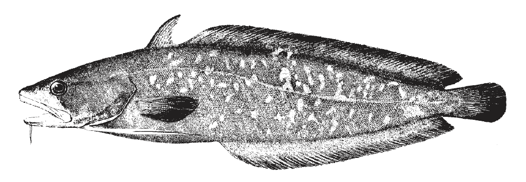 Spotted Hake, Urophycis regia. First dorsal fin without an elongated ray. Scale rows between first dorsal fin and lateral line 12 or fewer. Upper limb of first gill arch with 3 (rarely 2) rakers. A series of dark spots on head. First dorsal fin with a dark blotch and distinct white margin